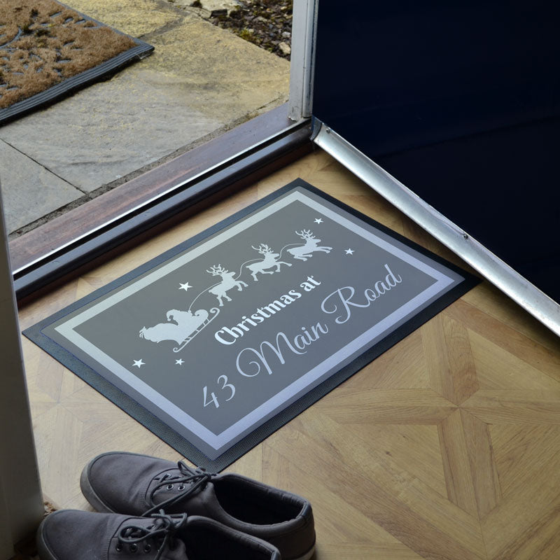Elevate your holiday welcome with our custom Christmas doormat. This elegant personalised doormat not only adds a touch of sophistication to your festive decor but also provides a functional and stylish way to greet your guests. The design is printed in white, light grey and dark grey and features an illustration of Santa Claus in his sleigh being pulled through the sky by his reindeer. Below this are the words "Christmas at" and then space for you to add your house name/number or family name.