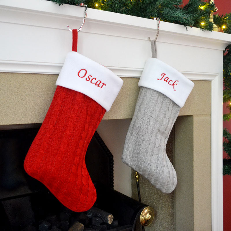 Add a touch of elegant festivity to your sitting room this Christmas with our personalised knitted Christmas stockings, perfect for the whole family. Available in light grey or Christmas red, these luxury stockings feature a classic knitted texture that seamlessly complements your existing holiday décor.