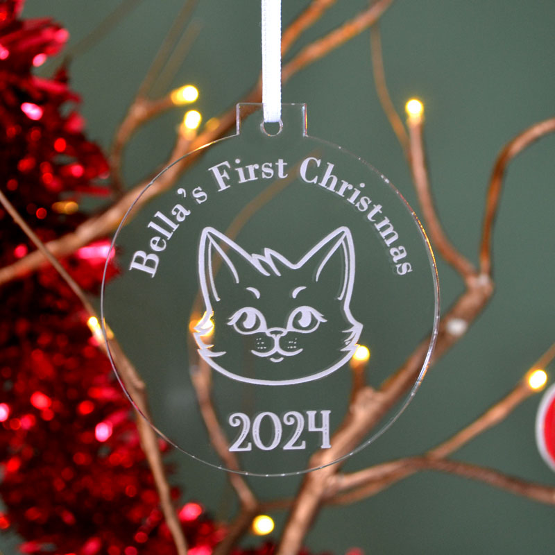 Mark your feline friend's first Christmas in style with our charming Personalised Cat Christmas Bauble. Lovingly crafted from high-quality clear acrylic, this delightful decoration is laser cut and engraved with: