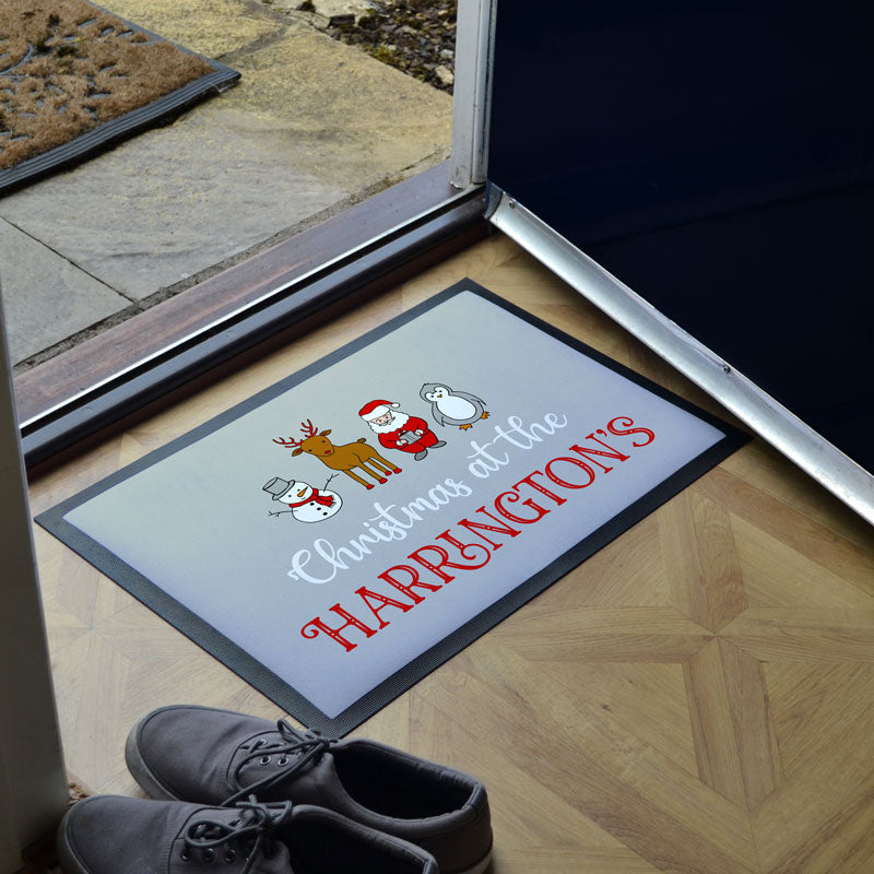 If you've got the tree, the stockings, the garland and all other Christmas decorations up, why not complete the festive set with one of our Christmas doormats? These cheerful mats make a great way to set the festive mood from the moment you open your font door. The mats are printed with a grey background which features a Santa, a snowman, a penguin and a reindeer characters above the words "Christmas at the" and space for you to add your family name or house name!