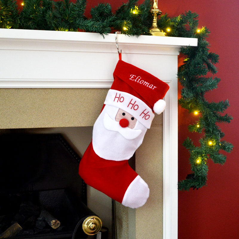 Add a touch of festive cheer to your home with our stunning Extra Large Personalised Santa Stocking. This whimsical stocking is designed to resemble Santa's jolly face, complete with a cream background, a plush white beard, a cheery red nose, and Santa's iconic red hat. Your chosen name will be elegantly embroidered in white lettering on Santa's hat, making this stocking a cherished part of your holiday tradition.