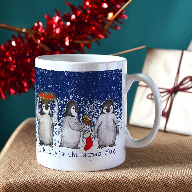 Treat someone you love to this beautiful personalised Christmas mug decorated with 4 festive penguins. This mug is a guaranteed favourite which will be the first out of the cupboard on Christmas morning! Perfect for penguin lovers and Christmas fanatics. The design is wrapped around the mug, scroll through the images to see the full version. The design can be personalised with a short message or name of your choice. The design is printed on a standard 10oz mug which is microwave and dishwasher safe.